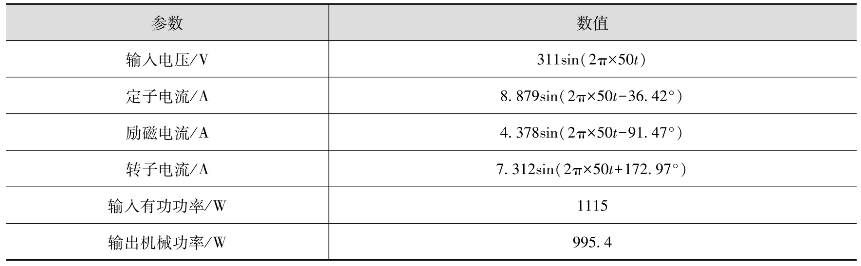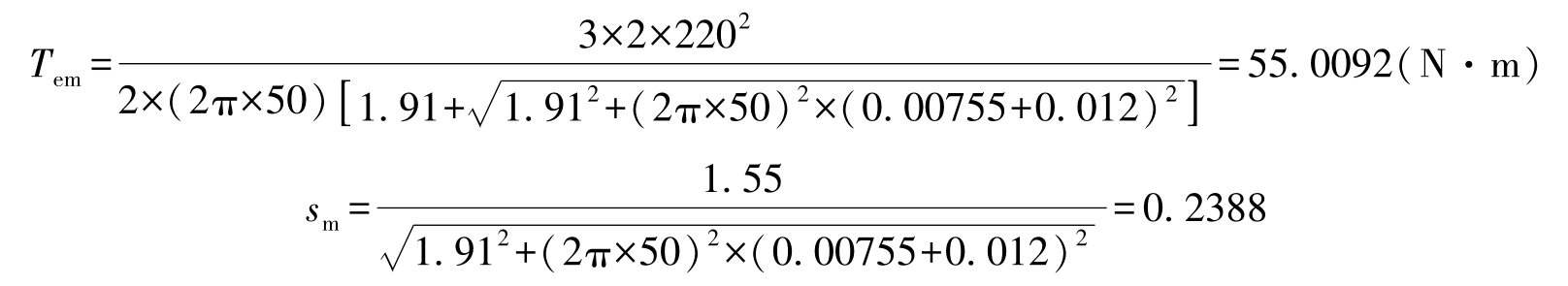 仿真中采用附录A表A-1所示的异步电机参数,利用MATLAB对电机在额定转速1440r/min、额定相电压220V(有效值)、额定频率50Hz状态下的T型等值电路(忽略铁损耗)进行仿真求解,结果见表3-1。可见额定运行时定子电流最大值为8.879A,为了考虑电机起动等动态过程中过电流限幅,仿真中按照额定电流的2倍限制定子电流最大值为8.879A×2=17.76A。根据前面的 T em 计算公式(3-6)及 s m 公式(3-7),计算最大转矩及对应的转差率如下: