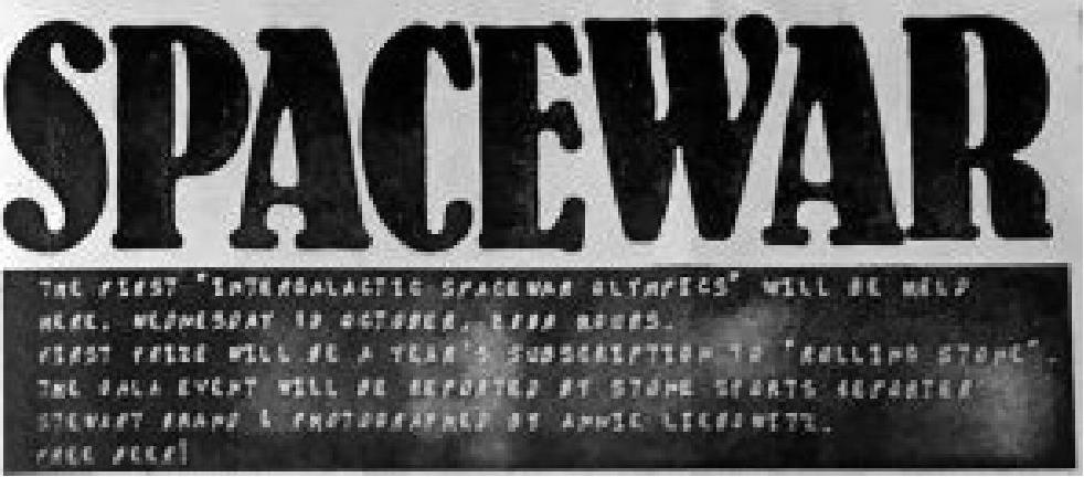 第一届“星际太空战奥林匹克运动会”(Intergalactic Spacewar Olympics)将于1972年10月19日星期三在此举行。一等奖奖品是一年的《滚石杂志》。此次盛会将由Stone Sports记者斯图尔特·布兰德(Stewart Brand)报道,并由安妮·莱博维茨(Annie Liebovitz)拍摄。现场提供免费啤酒哦!
