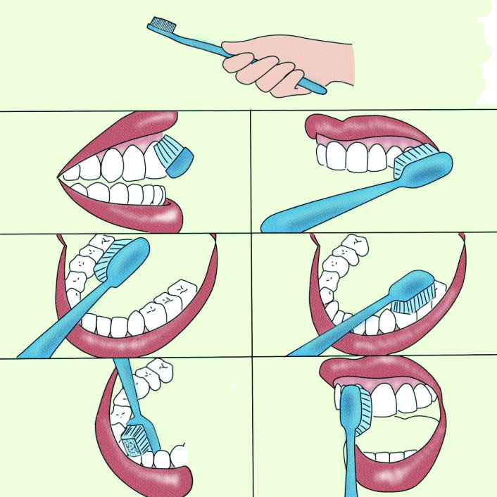 最后面的几颗牙齿是比较不易刷干净的,小窍门是刷毛仍对准牙齿,刷柄靠近大门牙。