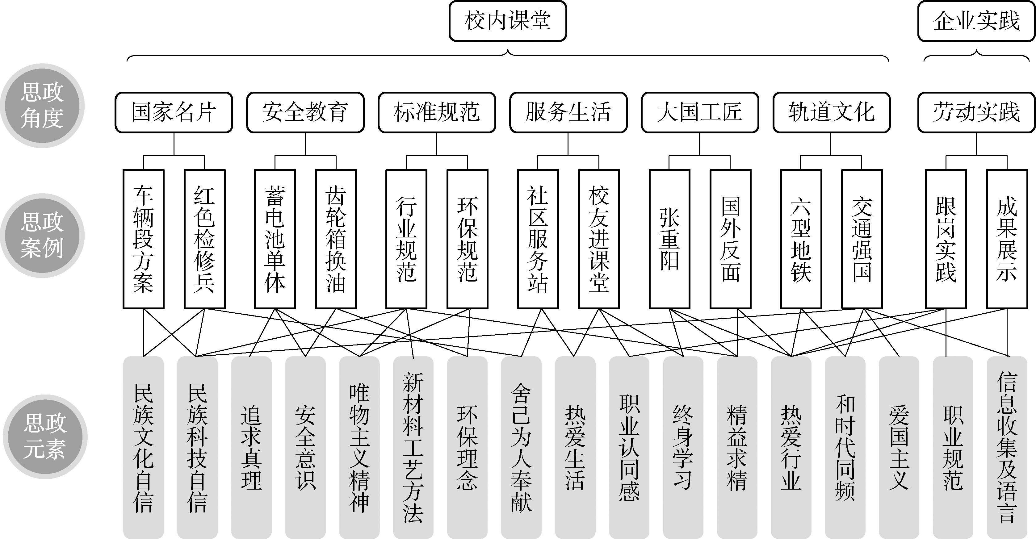 本案例提出了一种“思政角度—思政案例—思政元素”的课程思政新模式(见图1)。该课程实施学院和企业双元育人模式,实现德技并修、育训并举。团队成员梳理了课程思政元素,从国家名片、安全教育、标准规范、服务生活、大国工匠、轨道文化6个方面进行挖掘,开发出适合课程的12个思政案例,同时引入为期一周的企业劳动实践,将思政元素和课程有机融合,达到润物细无声的育人效果。