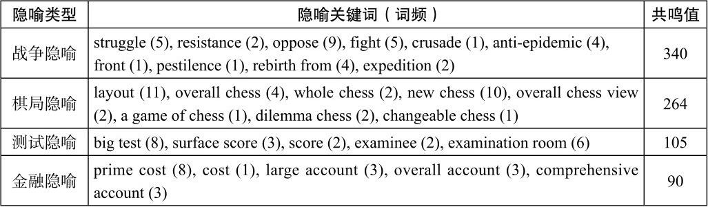 通过对自建的《中国日报》语料库进行文本细读和隐喻识别,获得了四种具有代表性的隐喻类型及其关键词和共鸣值,如表1所示。