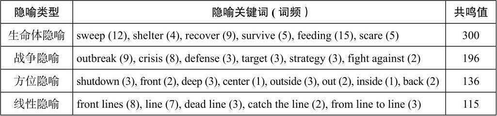 通过对自建的《纽约时报》语料库进行文本细读和隐喻识别,获得了四种具有代表性的隐喻类型及其关键词和共鸣值,如表2所示。