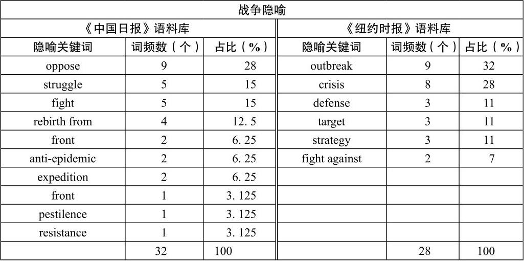 表3 战争隐喻在《中国日报》和《纽约时报》语料库中的分布