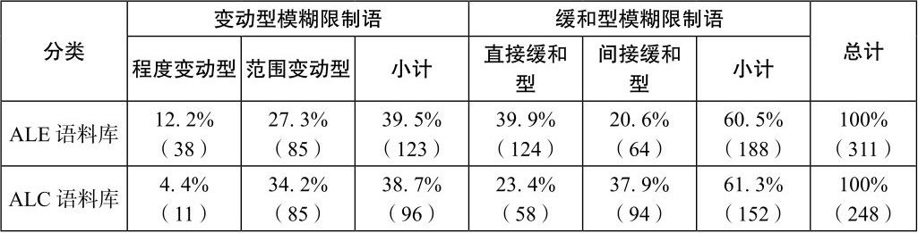 表1显示,ALE语料库模糊限制语的使用总频次要高于ALC语料库。模糊限制语在ALE语料库出现的总次数为311次,ALC语料库中则为248次。