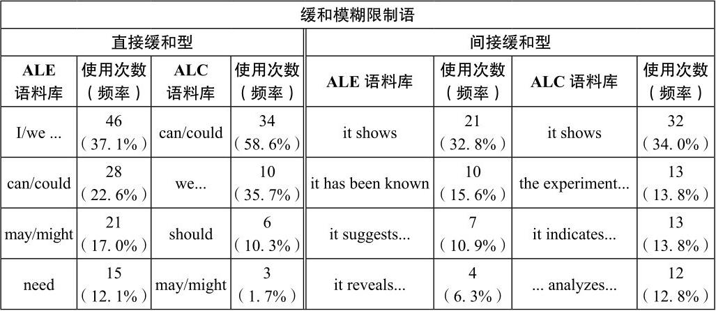 在使用直接缓和型模糊限制语时,两语料库的相同之处在于,双方都采用了情态动词来表示作者对某个事物持怀疑和犹豫态度,比如may/might/can/could/should。两者的差异在于,ALE语料库更常采用we/I think...等以第一人称为主语论述的句子,以表示作者对事物的直接猜测和阐述(46例);而ALC语料库采用第一人称为主语论述的句子只有10例。形成这种使用习惯的原因有:一是中西方集体主义与个人主义的区别。西方文化追求自由,优先个人,因此在说话做事时会把自我放在首位,而中国文化更注重集体观念,因此在论文观点表达方面会更注重论文本身,而将作者本人隐身于文章中。二是中西方对待学术论文的情况不同。西方人热情豪放的性格使得西方作者在撰写论文时会表达作者本人的情感态度,而中国人注重谦逊态度,因此在论文写作时会保持谨慎态度,克制自己的私人情感。三是两种语言体系存在差异,英语情态动词类词语相较于汉语来说更加丰富,因此以汉语为本族语的作者在使用英语类情态动词时会缺少熟练性。