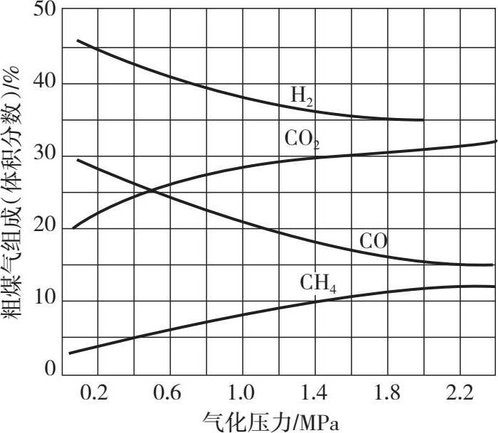 图3.2.3为粗煤气组成与气化压力的关系图,从图3.2.3中可见,压力对煤气中各气体组成的影响不同,随着压力的增加,粗煤气中甲烷和二氧化碳含量增加,而氢气和一氧化碳含量则减少。因此,压力越高,一氧化碳平衡浓度越低,煤气产率随之降低。