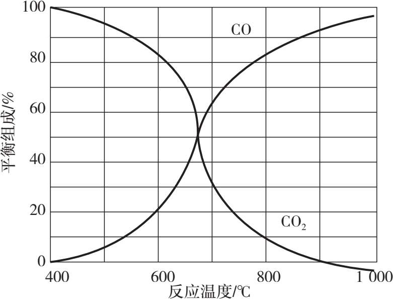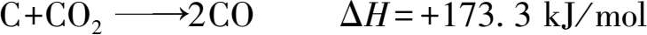 C与CO 2 反应生成CO,反应如式(3.8)所示,反应在不同温度下CO 2 与CO的平衡组成见表3.2.2,如图3.2.1所示。