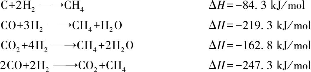 由上述可知,在煤炭气化中,可根据生产产品的要求确定气化压力,当气化炉煤气主要用作化工原料时,可在低压下生产;当所生产气化煤气需要较高热值时,可采用加压气化。这是因为压力提高后,在气化炉内,在H 2 气氛中,CH 4 产率随压力提高迅速增加,发生如下反应: