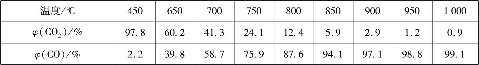 从表3.2.2中可以看到,随着温度升高,其还原产物CO的含量增加。当温度升高到1000℃时,CO的平衡组成为99.1%。