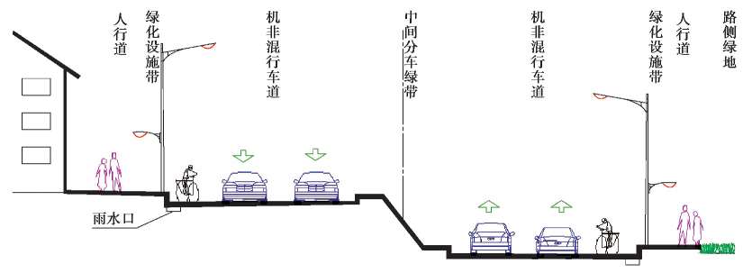 单幅路由机非混行车道和路侧带组成,适用于机动车交通量不大、非机动车辆较少的次干路、支路以及用地不足、拆迁困难的旧城市道路,如图 2.4 所示。