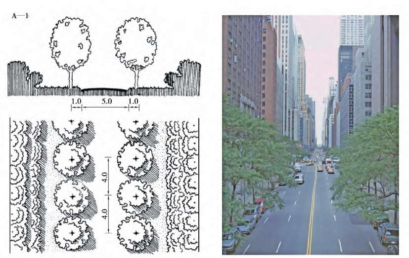 四幅路所对应的道路景观布置形式为四板五带式,是比较完整的道路绿化形式。如果道路面积有限,可用栏杆分隔,方便各种车辆上行、下行互不干扰,利于限定车速和保障交通安全。其优点是绿化量大,街道美观,生态效益显著,而它的缺点则是占地面积大,不经济,如图2.11 所示。