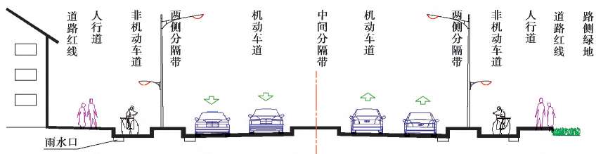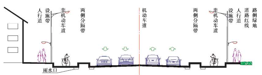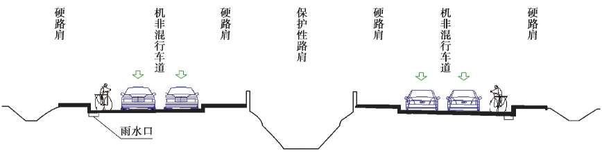 这种两块板路由中间保护性路肩、机非混行道和外侧路肩组成。传统两块板路路面设有雨水径流排向两侧的雨水口,如图 2.13 所示。