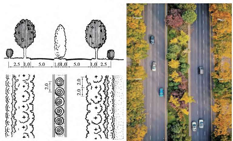 如图 2.9 所示,三幅路所对应的道路景观布置形式为三板四带式,为城市道路绿化较理想的形式。其优点是绿化量大,卫生防护及夏季遮阴效果较好,组织交通方便,安全可靠;缺点是用地面积大,不经济。