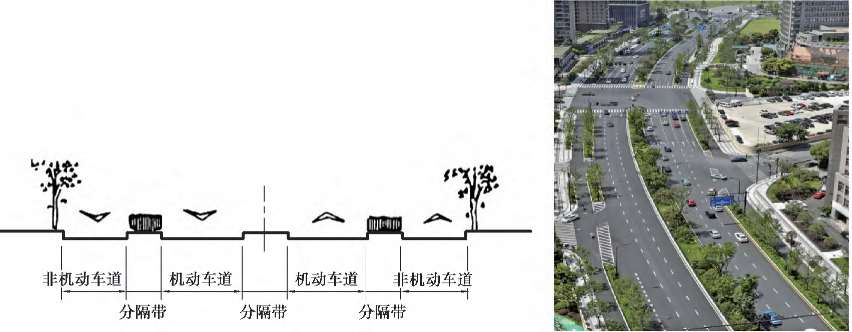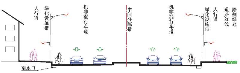 三幅路由机动车道、两侧分隔带、非机动车道和路侧带组成,适用于机动车交通量大、非机动车多的城市主干道,如图 2.8 所示。