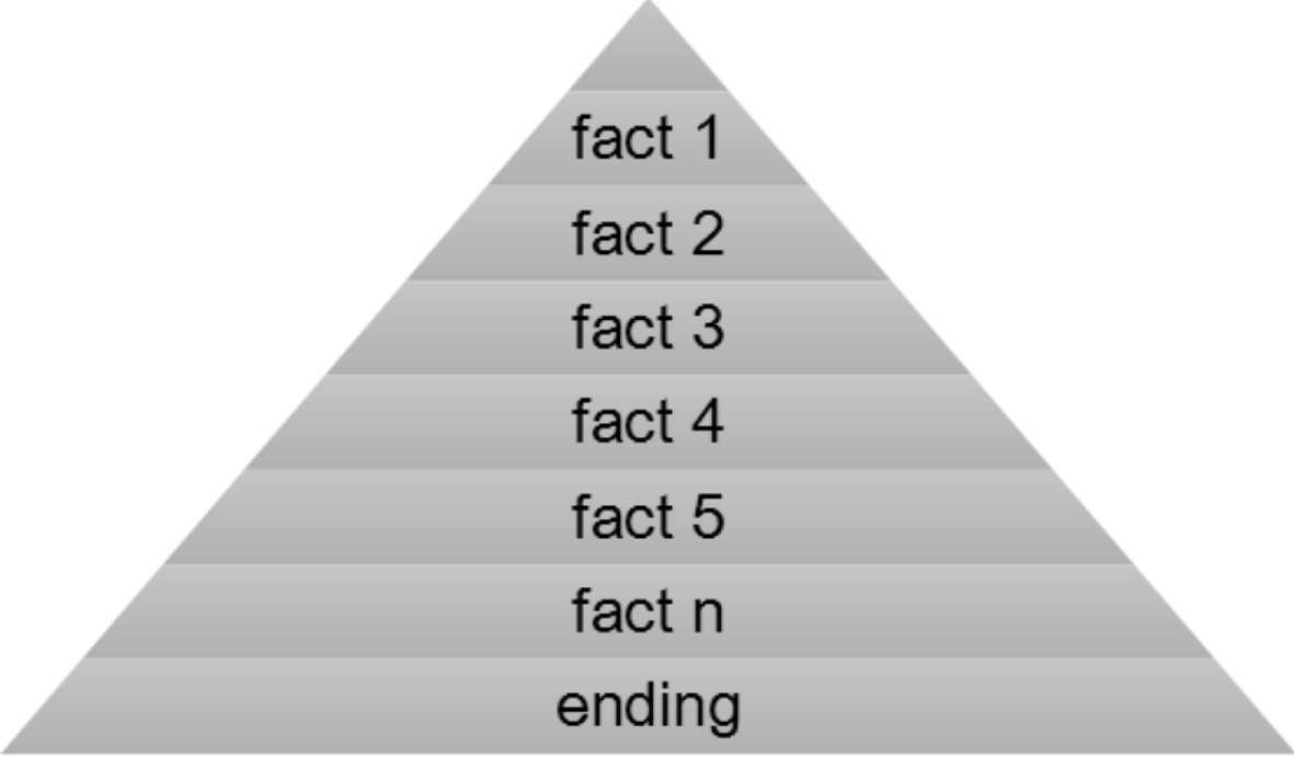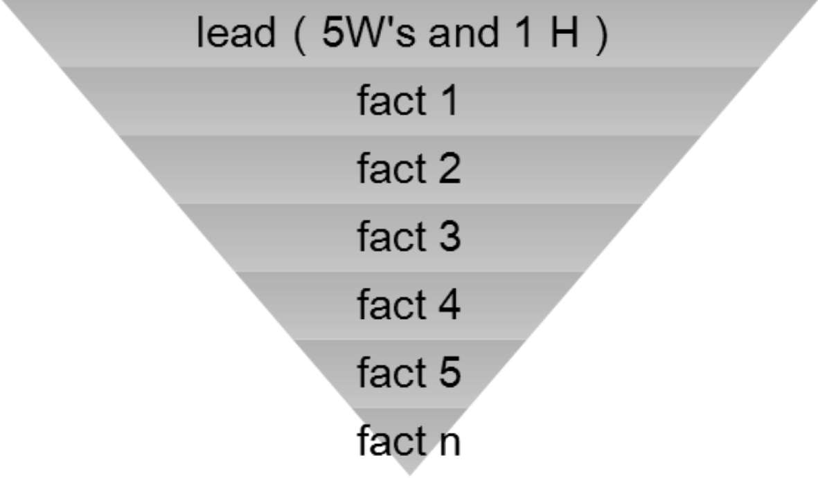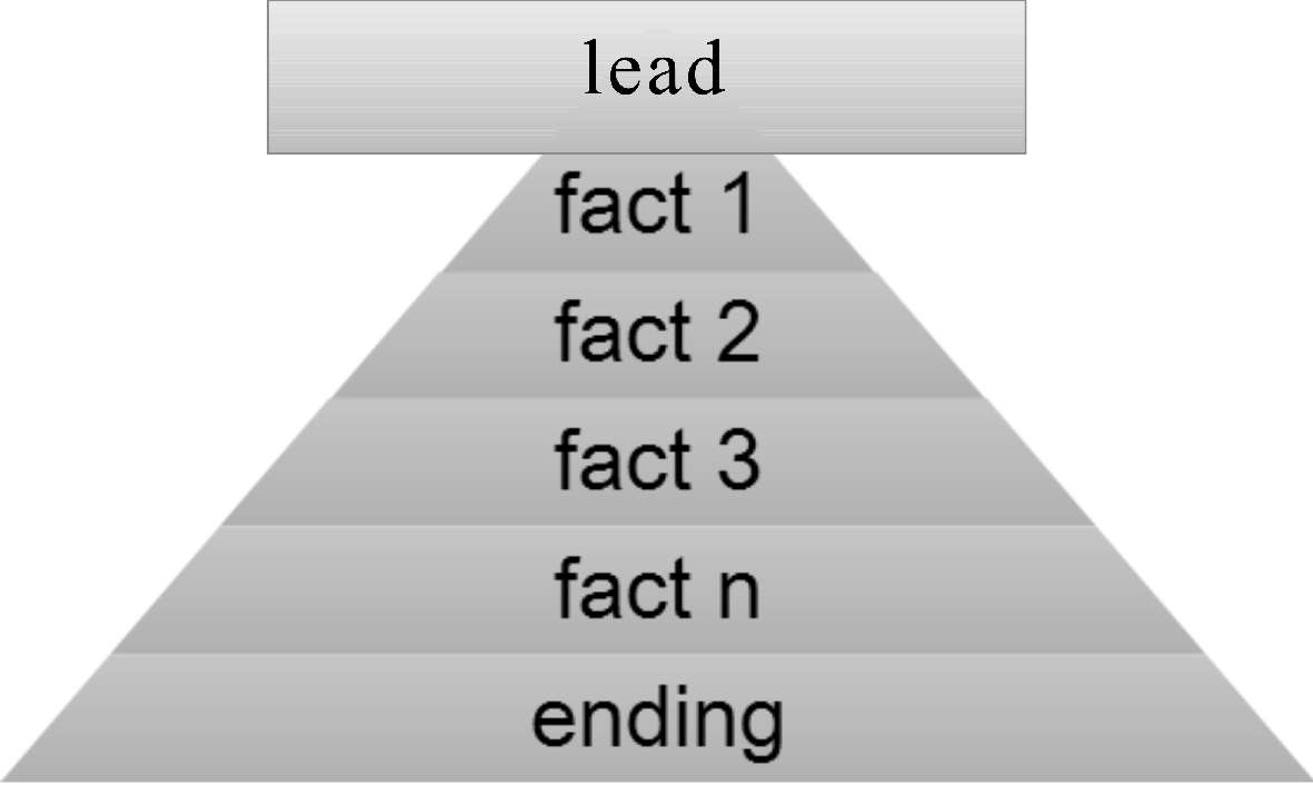 其中典型的“倒金字塔结构”的特点是让观众在第一时间就得知发生了什么事,并将事件的来龙去脉等次要的信息放在导语后面。这种结构多用于报道内容相对简单、没有过多细节的新闻事件。这样的安排,好似形成了一座倒放的金字塔。这种结构的导语一般都含有五W和一个H构成的“新闻六要素”,即WHO,WHAT,WHEN,WHERE,WHY和HOW。
