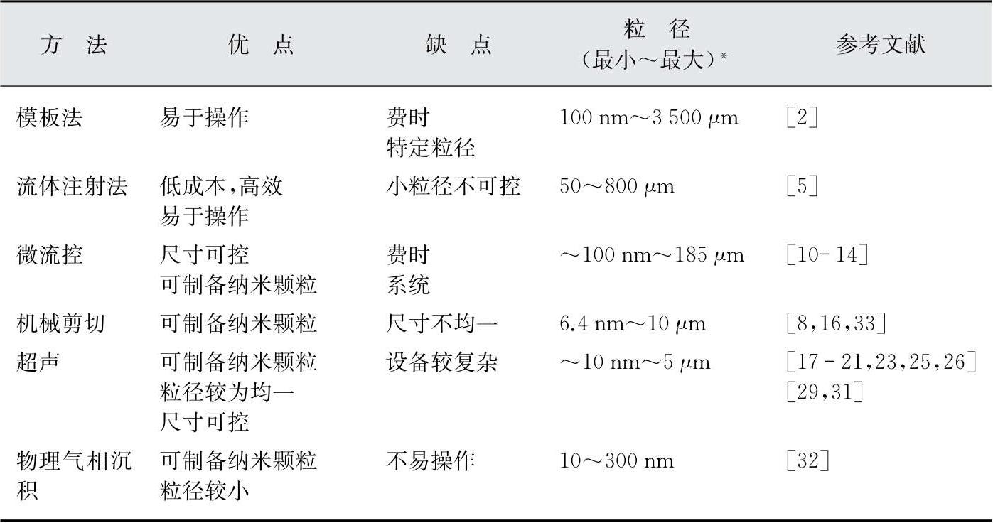 ∗该范围基于显微镜图像中显示的颗粒或发表论文中清楚显示的颗粒直径。每种方法都可能产生不均一的颗粒。因此,表中所列范围只是一个大概的参考。此外,应注意的是,该范围与平均粒径没有直接关系。
