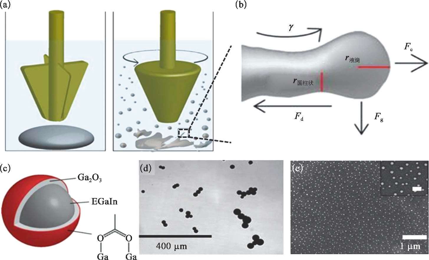 (a)~(b)机械剪切法的原理示意;(c)~(e)液态金属颗粒的结构图和电镜图 [16] 。