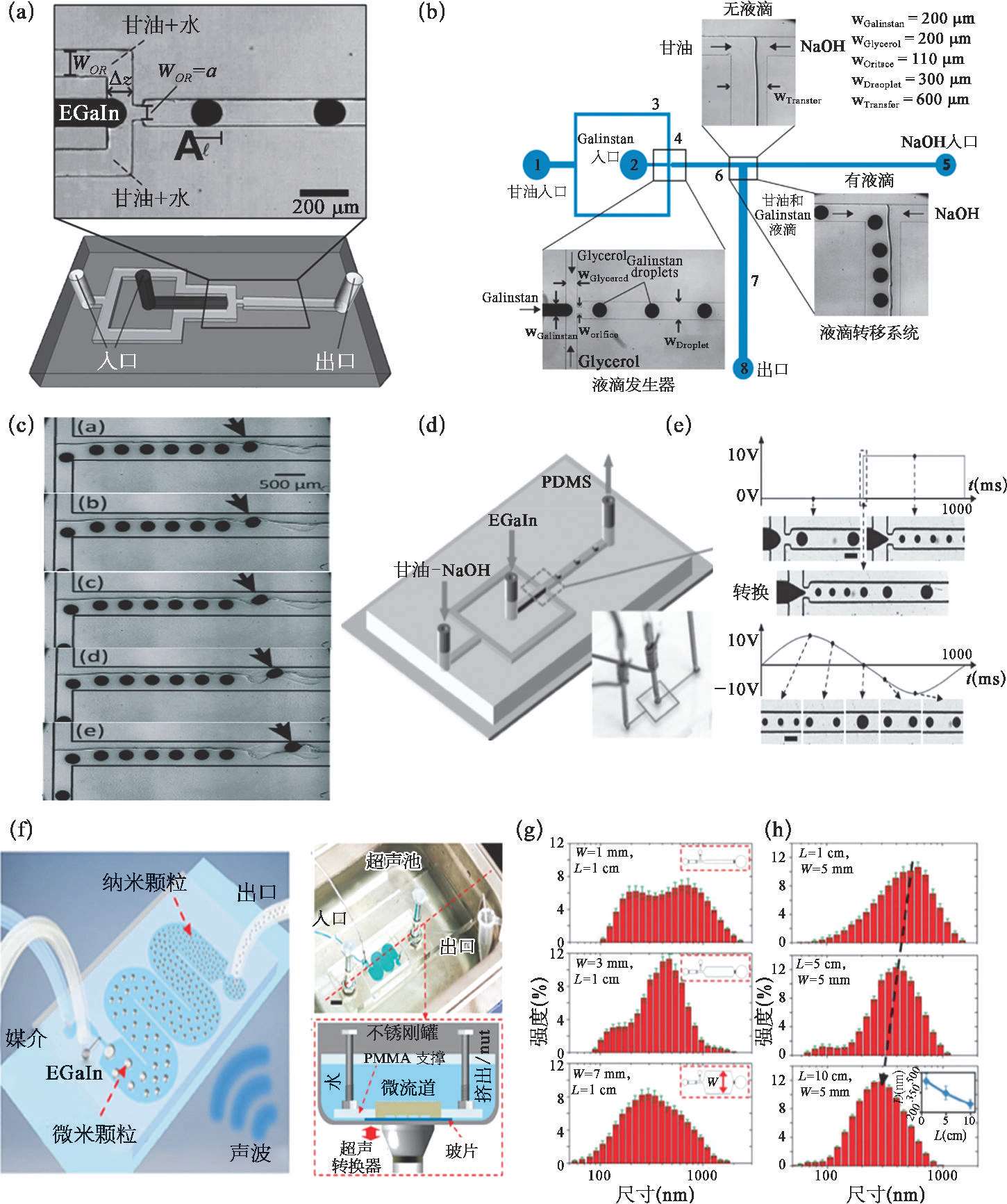 (a)传统的微流体技术设备;(b)~(c)液态金属微球与甘油分离;(d)~(e)改变液态金属表面张力来控制液态金属颗粒的直径和形成频率;(f)超声波辅助的微流体技术;(g)使用不同宽度的微通道获得的液态金属纳米颗粒的尺寸分布;(h)不同长度的微通道获得的纳米颗粒的尺寸分布[10,1214]。