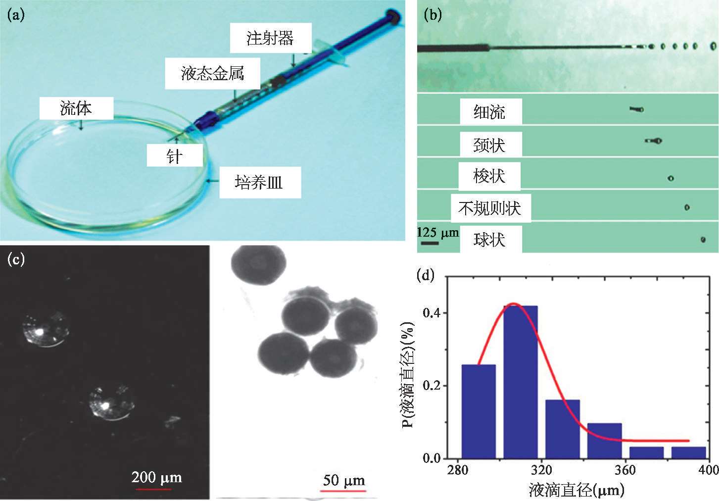 (a)流体喷射法装置,主要包括注射器、针头和培养皿;(b)高速摄像机检测到的液滴制造的详细过程,连续的细流在距针头一定距离处破碎成液滴;(c)通过流体喷射法制造的液态金属颗粒;(d)由流体喷射法制造的液滴直径的直方图 [5] 。