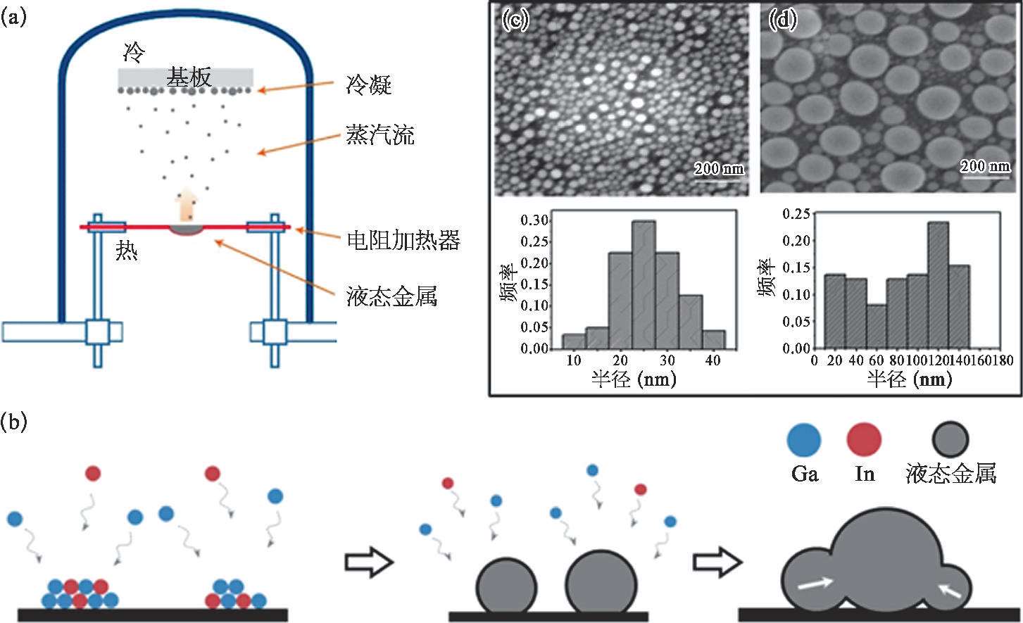 (a)~(b)采用物理气相沉积法制备液态金属纳米颗粒的示意;(c)~(d)Si衬底上沉积的EGaIn纳米颗粒的电镜图像(顶部)和相应的粒径直方图(底部) [32] 。