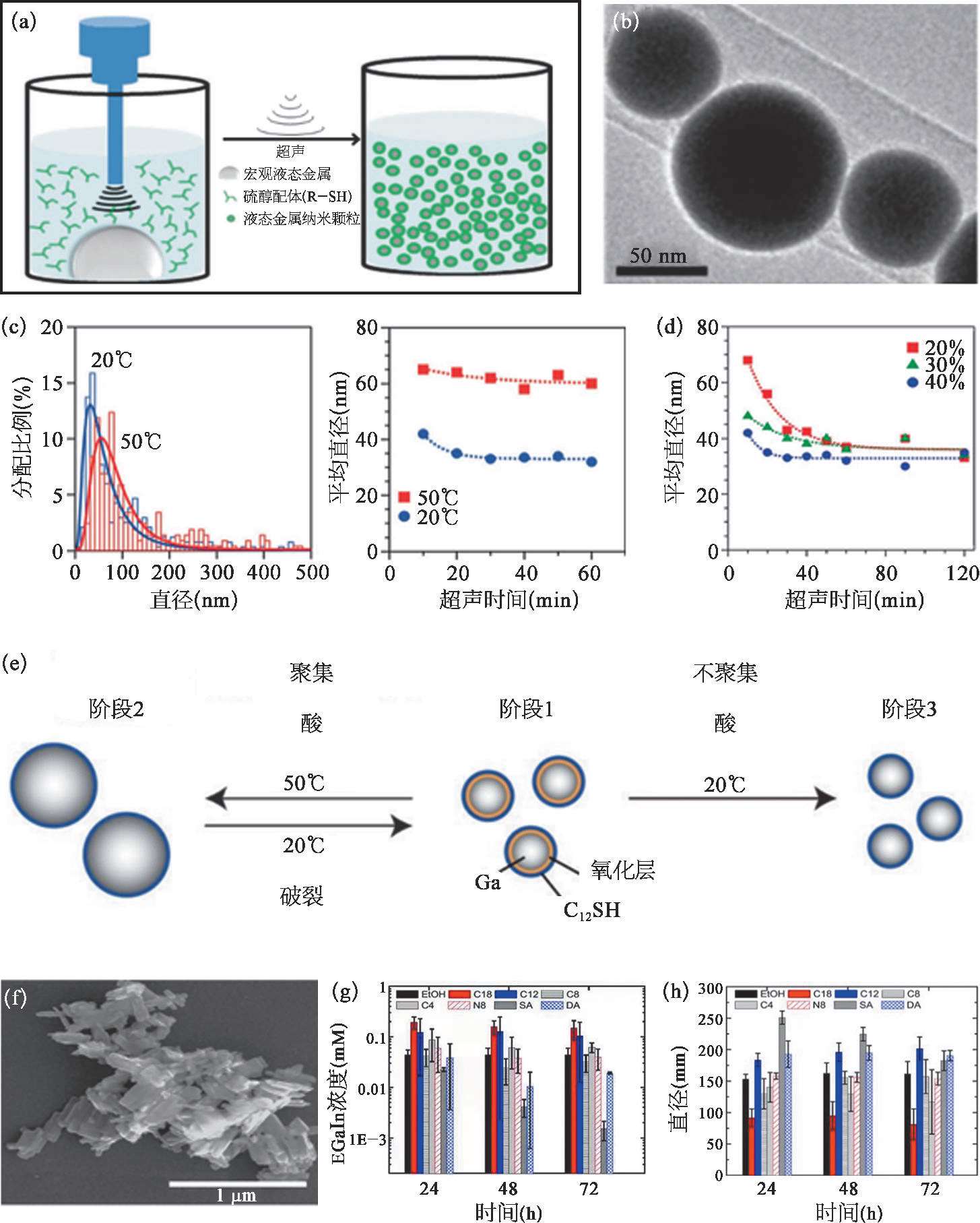 (a)超声处理示意;(b)液态金属微纳米颗粒的电镜图,显示出其氧化层结构;(c)不同超声处理温度下,平均粒径和超声处理时间的关系;(d)不同超声功率下,超声时间与平均粒径的关系;(e)液态金属微纳米颗粒实现可逆的尺寸控制;(f)片状结构的α-Ga 2 O 3 的电镜图;(g)~(h)在多种表面活性剂中超声获得的液态金属纳米颗粒的浓度和稳定性。