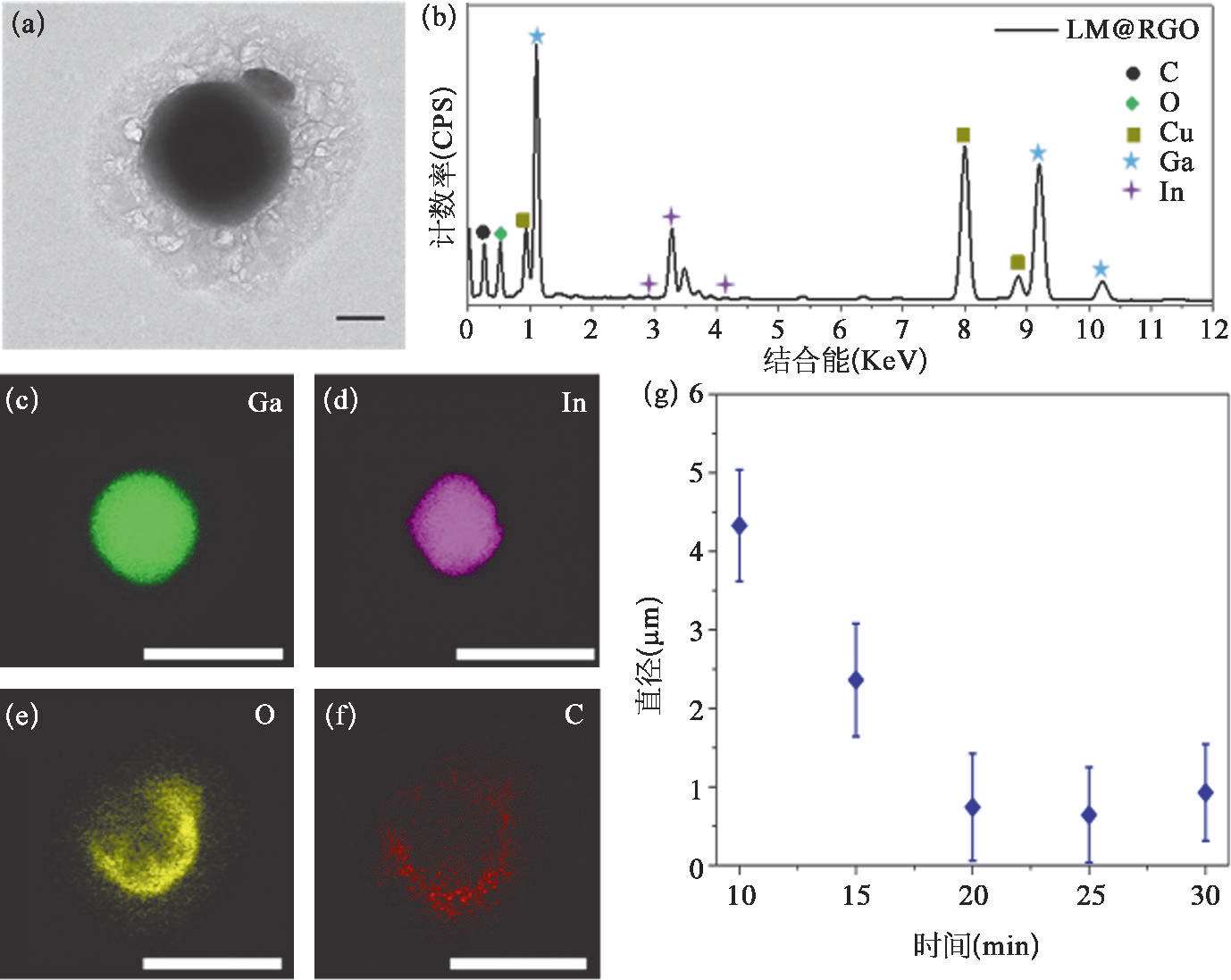 (a)LM@RGO的透射电镜图,标尺为200nm。(b)LM@RGO的元素组成,它由Ga、In、C和O组成。Cu来自透射电镜所用的碳网。(c)~(f)LM@RGO的元素面扫描图,从左至右分别为Ga、In、O和C,标尺为600nm。(g)LM@RGO的平均粒径随超声时长的变化。