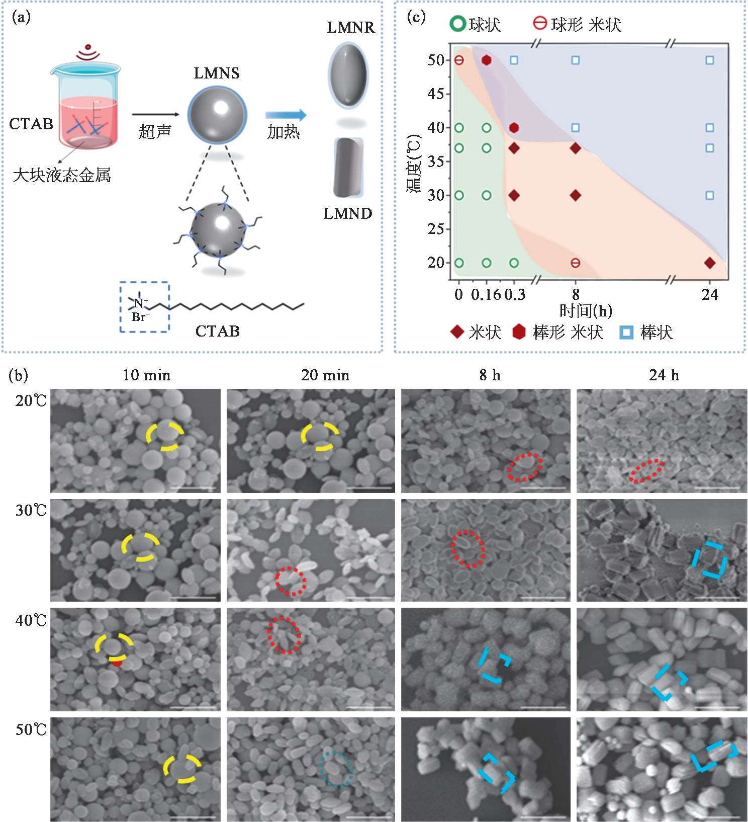 (a)可变形液态金属微纳米颗粒的制备流程示意;(b)可变形液态金属微纳米颗粒在不同温度和时间下的微观形貌图(SEM);(c)球形、米状和棒状液态金属微纳米颗粒对应的时间与温度图。