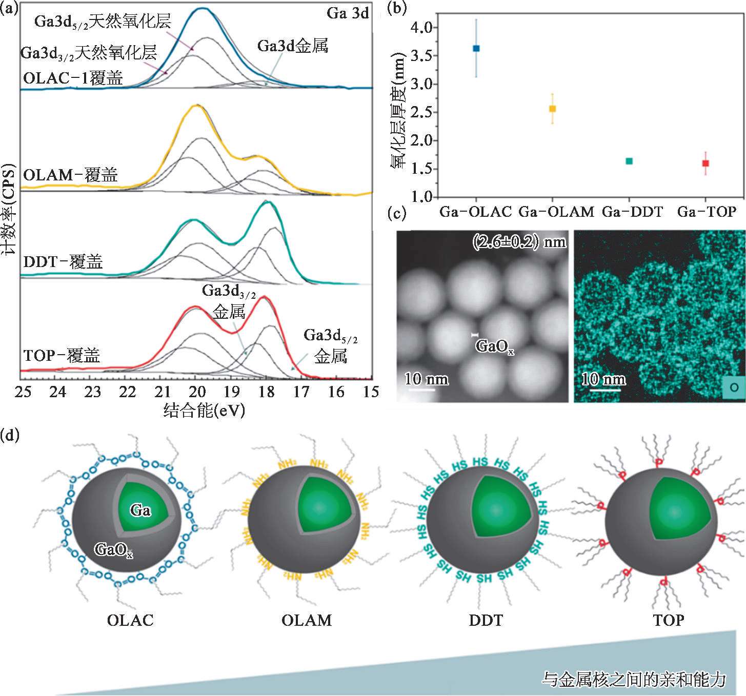 (a)通过XPS光谱可以计算不同有机配体修饰的颗粒中Ga和Ga2O 3 的比例,以及氧化层的厚度;(b)不同配体对应的氧化层厚度OLAC>OLAM>DDT~TOP;(c)HAADF-STEM对氧化层厚度的表征说明了实际值和计算值接近;(d)从热力学和动力学的角度剖析。