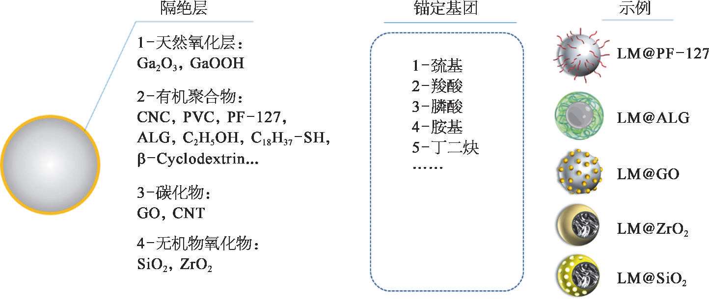 目前主要有两种形成液态金属纳米颗粒的方法,最简单的方法依赖于在液态金属表面上形成自限界面氧化层(图2-7),但是,天然氧化层不稳定,可溶解在酸或碱溶液中。一种更精准的表面钝化技术是利用物理吸附或者化学反应。物理吸附以静电吸附为主;化学反应则是利用在液态金属表面的配体。这种配体通常由结合到液态金属表面的锚定基团和可自组装成有序阻挡层的尾基团组成。常用的锚定基团包括硫醇基团,非硫醇锚定物通常会附着到界面氧化物而不是裸的液态金属或金属合金表面。