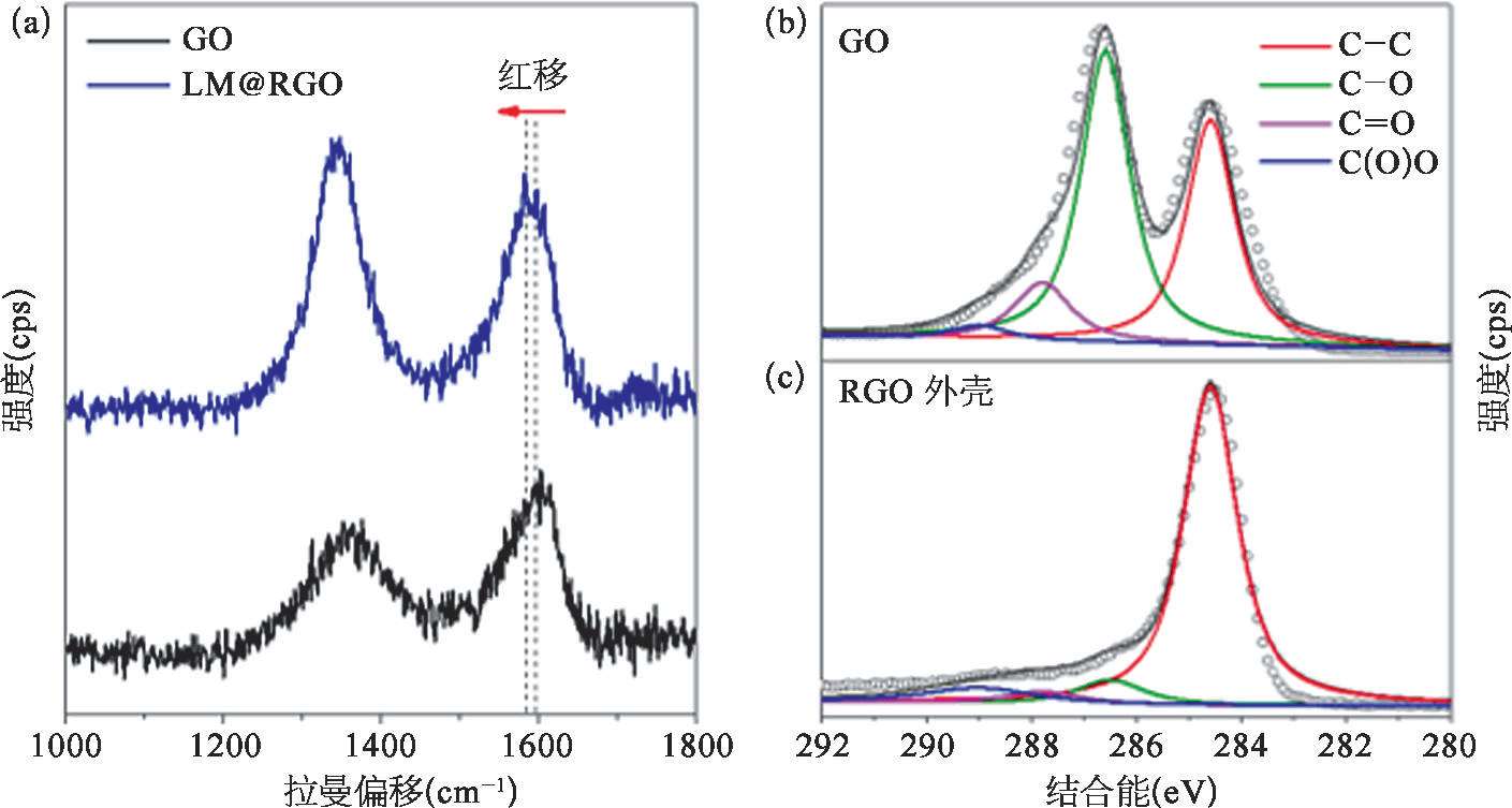 (a)GO和RGO外壳的拉曼光谱分析结果;(b)~(c)GO和RGO外壳在C1s轨道的XPS曲线。