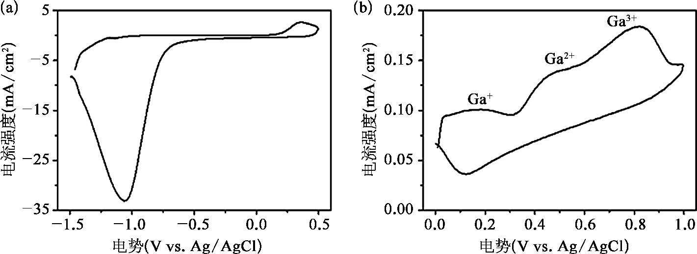(a)在浓度为1.0mol/L的HCl溶液中GO的循环伏安曲线;(b)在浓度为1.0mol/L的HCl溶液中Ga的循环伏安曲线。
