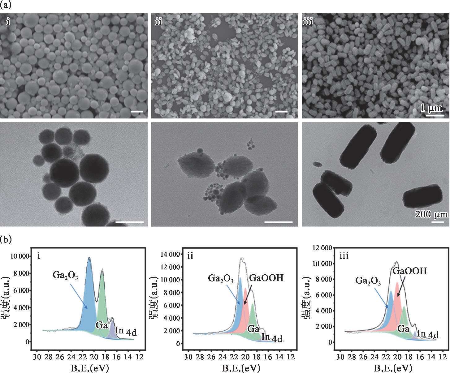 (a)扫描电镜和透射电镜下的形貌图;(b)X射线光电子能谱分析图,其中(i)球形、(ii)米状和(iii)棒状。