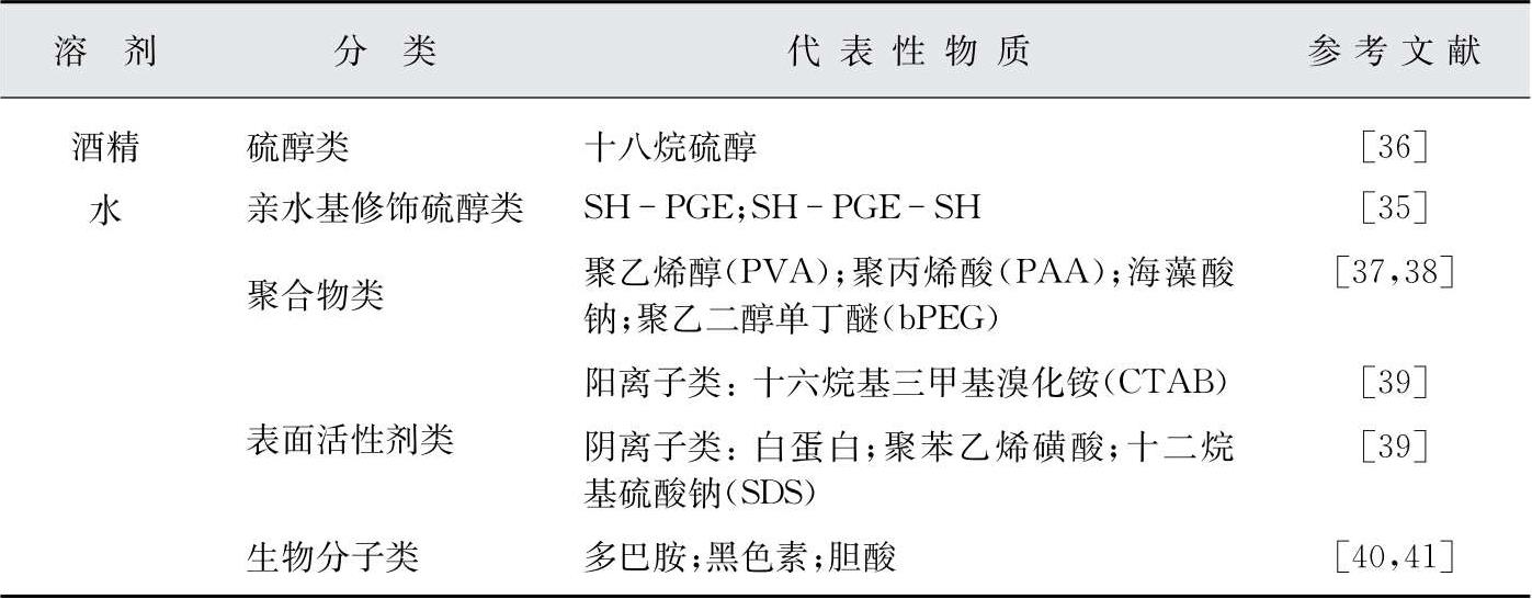 利用有机化合物对液态金属纳米颗粒进行修饰是目前较为常用的表面修饰方法,已报道过的有机聚合物包括PVC、CNC、PF-127、ALG、C 2 H 5 OH、C 18 H 37 -SH、β-Cyclodextrin等,锚定基团包括巯基、羧基、膦酸基团、氨基、丁二炔等。在水溶液中液态金属微纳米颗粒表面的修饰物可大致分为4大类,即表面活性剂类、聚合物类、硫醇修饰的PEG类和生物分子类 [35] (表2-2)。