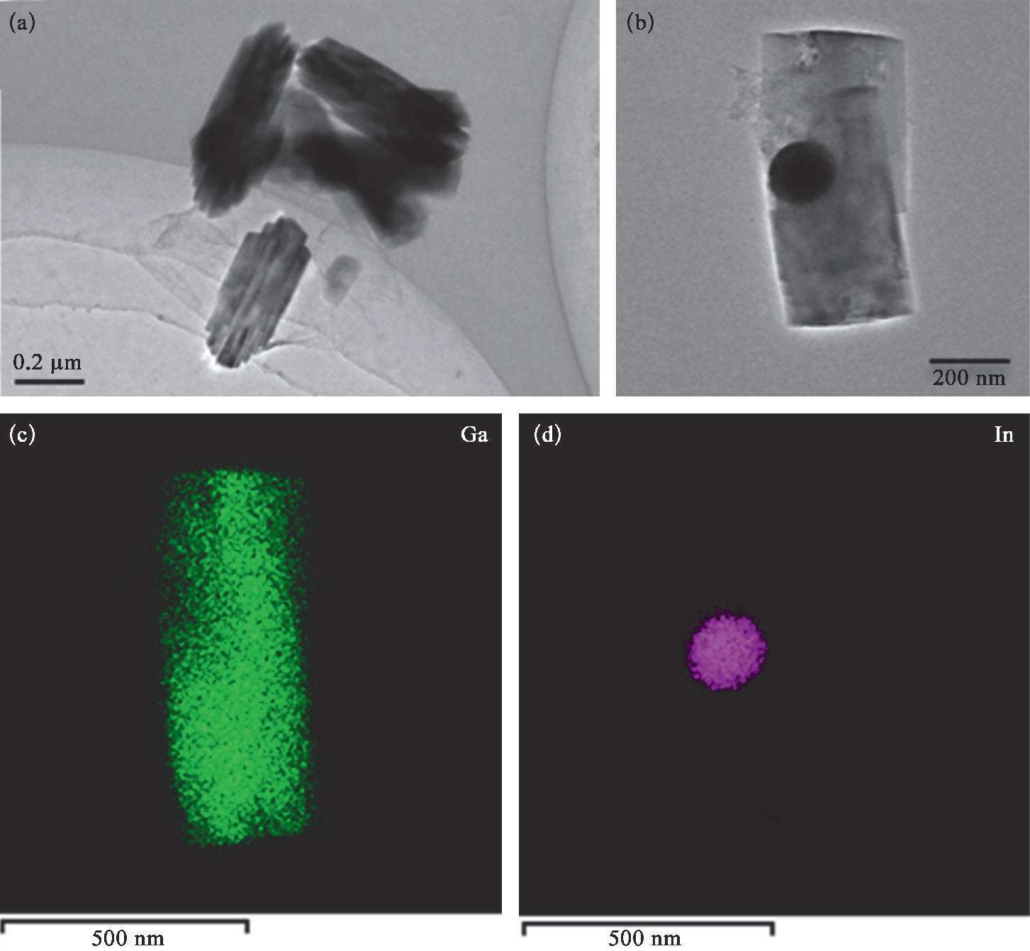 (a)离心后的纳米颗粒样品的透射电镜图;(b)样品的放大图;(c)~(d)离心后纳米颗粒样品中Ga和In的分布。