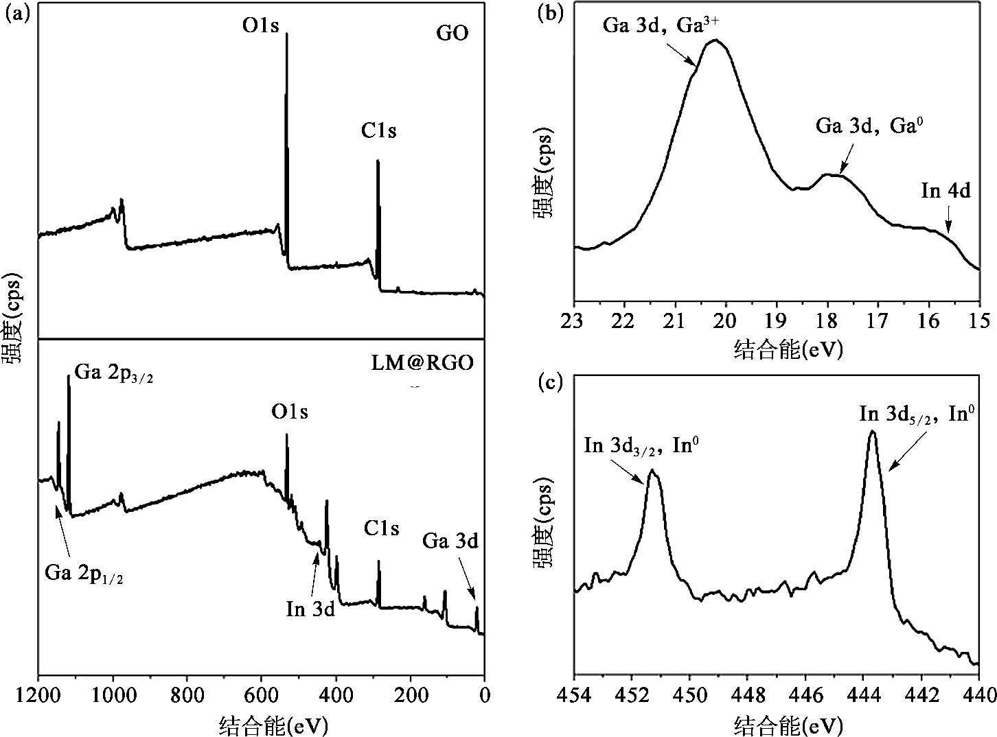 (a)对全部元素区域内的GO和LM@RGO的XPS光谱的对比;(b)LM@RGO在Ga3d轨道的高分辨率的XPS光谱;(c)LM@RGO在In3d轨道的高分辨率的XPS光谱。
