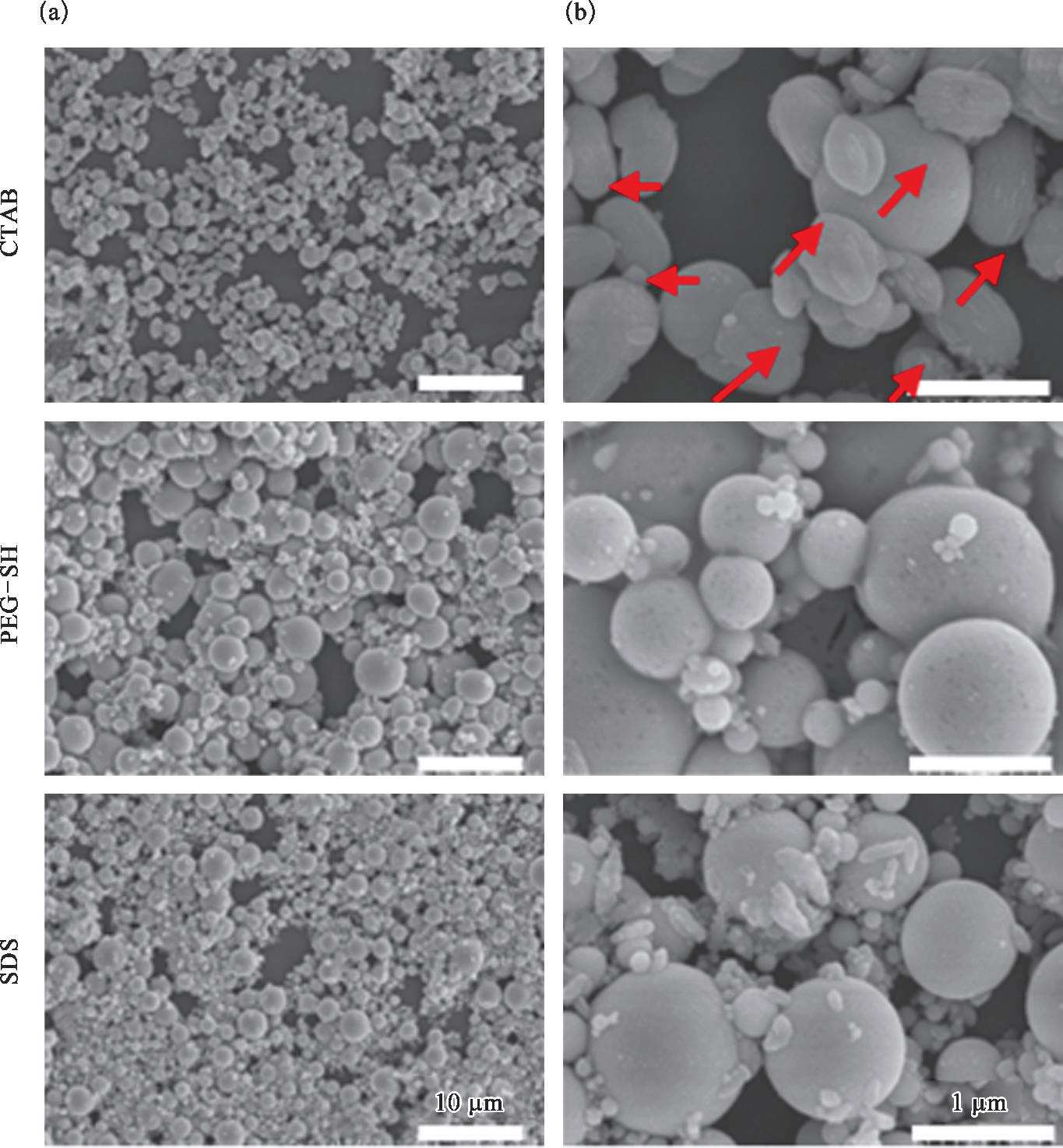 不同有机聚合物修饰对于纳米液态金属的形状、粒径、表面电势会产生不同的影响。通过扫描电子显微镜对CTAB、PEG-SH、SDS的液态金属微纳米颗粒的形貌进行观察,结果如图2-9所示,在37℃的去离子水溶液中放置48h后,CTAB修饰的纳米液态金属颗粒从球形变为棒状的GaOOH,而PEG-SH和SDS修饰的纳米液态金属颗粒仍为球形,其表面增加了较多不规则颗粒物,但没有产生整体性的棒状变形。此外,研究者还表征了3种溶液在4℃去离子水溶液环境中48h前后的微观形貌。由图2-9可知,CTAB修饰的纳米颗粒部分由球形变为米状,即产生了向棒状GaOOH转变的趋势;其余两种修饰物包裹的颗粒物则仍为球形。