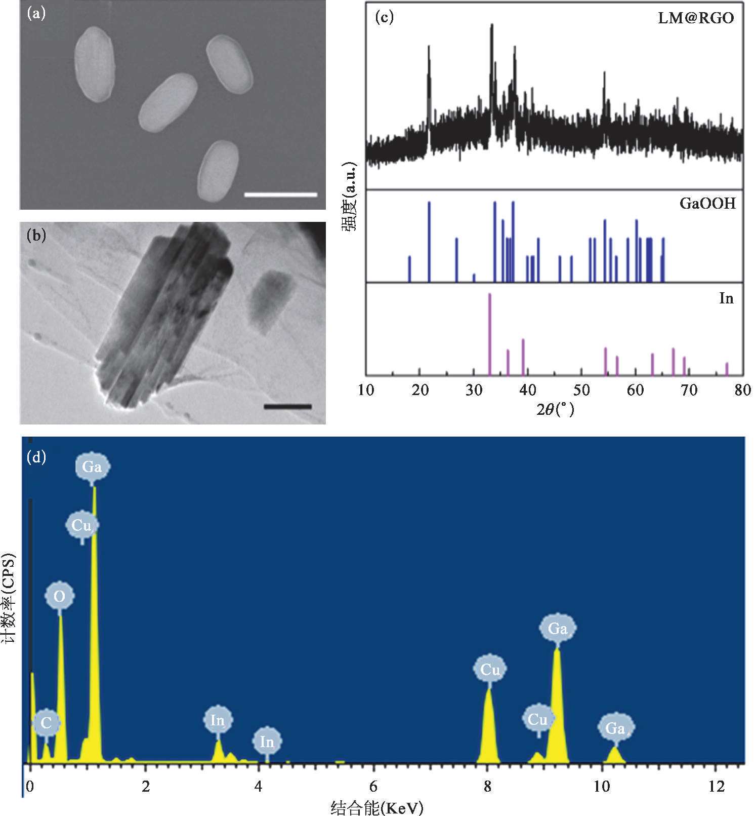 将超声制备的液态金属纳米颗粒转移至去离子水中,滴在干净的硅片表面,并在30℃下真空干燥。在扫描电子显微镜(HITACHI S-4800)下,对LM@RGO的形貌和尺寸进行观察和统计。另外,将含有LM@RGO的溶液滴在超薄碳网上,利用透射电镜(JEM-2100)对LM@RGO的形貌进行观察,透射电镜的操作电压为200kV。同时,利用透射电镜配备的能量色散X射线光谱(EDS)对LM@RGO的组成元素进行分析。使用拉曼光谱仪(Via- Reflex)对GO和LM@RGO的RGO外壳的拉曼光谱进行测量和记录,其激光光源的波长为532nm。使用电子光谱仪(ESCALab220i-XL)分析GO和LM@RGO的RGO外壳的官能团,对GO的还原程度进行分析。在XPS测试中,使用300W的Al Kα辐射源。采用衍射仪(Bruker D8 Focus diffractometer)对离心后的样品进行晶体结构分析。采用动态光散射系统(Zetasizer Nano ZS)对不同pH的溶液中固体Ga纳米颗粒的Zeta电势进行测量,其中溶液的pH采用pH计(PHS-3C)测量得到。