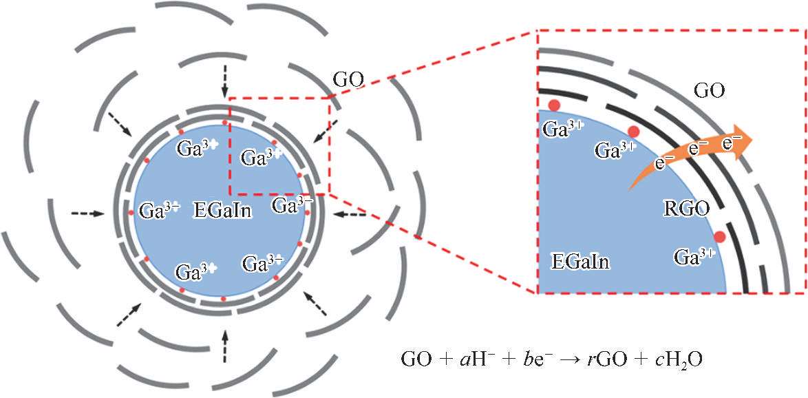 图2-20 在酸性溶液中,液态金属纳米颗粒表面发生的GO部分还原和RGO自组装的机理示意 [53]