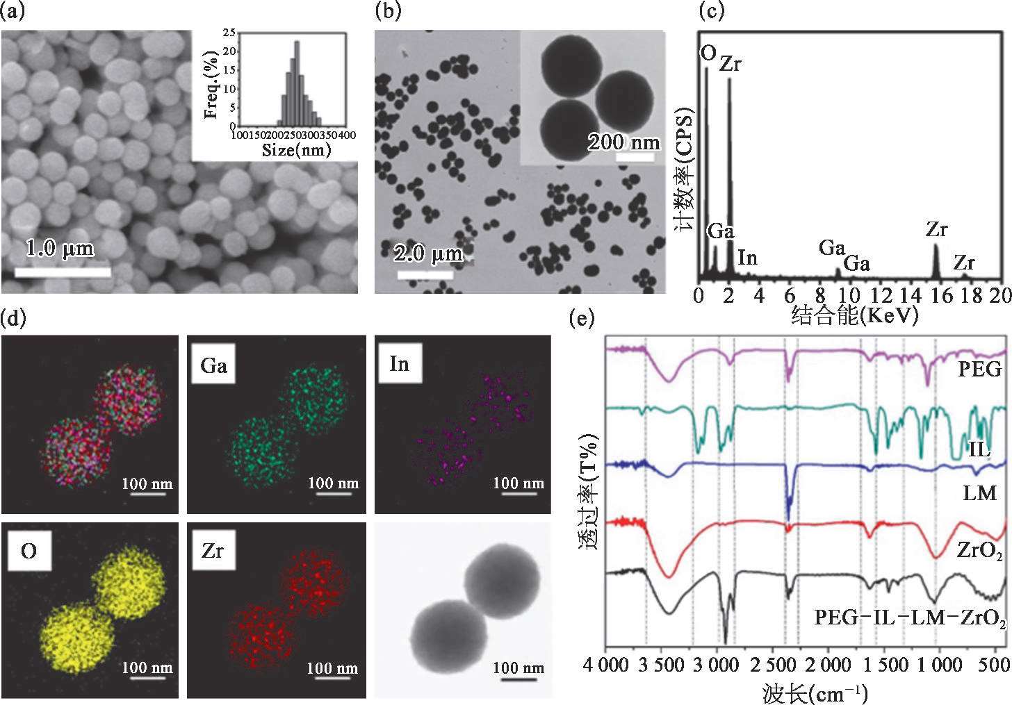 如图2-22中SEM和TEM图像所示,生成的LM-ZrO 2 NCs基本上是直径为(260±60)nm的球形固体纳米颗粒[图2-22(a)和(b)]。LM-ZrO 2 NCs的EDS结果表明NCs中含有O、Zr、Ga和In元素[图2-22(c)]。如图中所示,O、Zr、Ga和In元素均匀混合在一起[图2-22(d)]。结果表明,所制备的液态金属纳米材料具有粒径分布均匀、分散性好的特点。