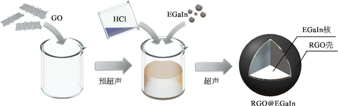 碳基材料如还原石墨烯(RGO)具有良好的导电性和离子透过性 [43] ,并且容易通过还原剂(一水合肼 [44,45] 、硼氢化钠 [46,47] 、碘化氢 [48] 、维生素C [49] 和数种金属 [50-52] )对氧化石墨烯(graphene oxide,GO)进行还原的方法制备。为了增加液态金属纳米颗粒表面的离子透过性,RGO可以作为惰性表面活性剂的合适替代品。这里以RGO包裹液态金属为例,详细讲解石墨烯液态金属纳米颗粒的制备与性能。