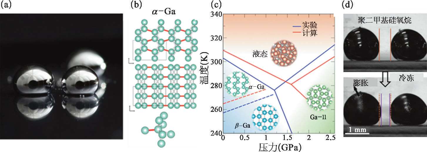 (a)镓二元合金宏观形貌;(b)α-Ga的晶体结构,红色表示共价键;(c)Ga的相图 [43] ;(d)Ga在相变过程中的异常密度(体积)变化 [45] 。