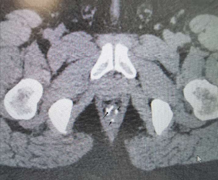 图 2—25 黑色箭头所指为残钉在CT中的显影