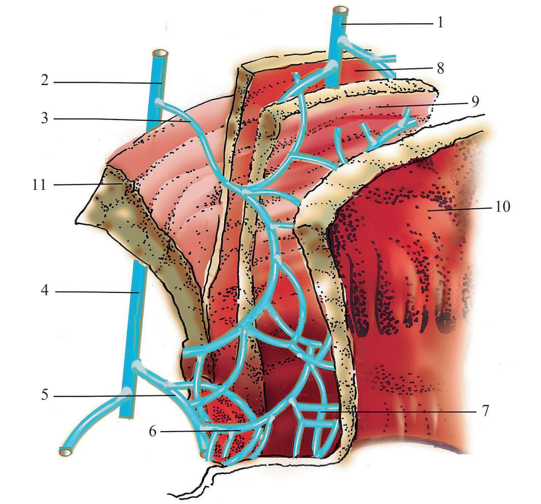 1.直肠上静脉 2.髂内静脉 3.直肠下静脉 4.阴部内静脉 5.肛门静脉 6.痔外静脉丛7.痔内静脉丛 8.纵肌层 9.环肌层 10.黏膜 11.肛提肌
