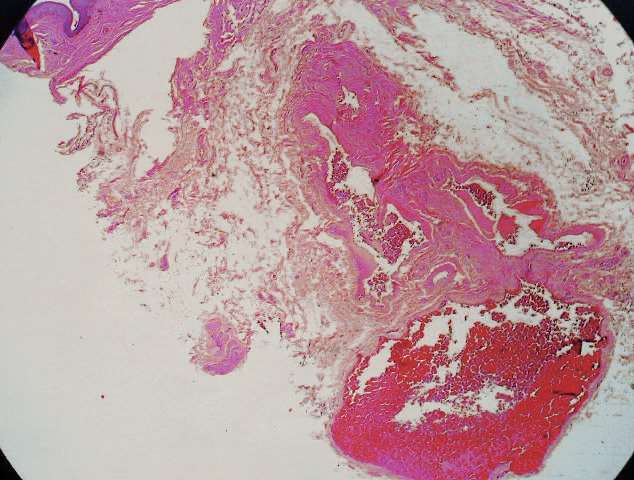 2.痔组织内的血管病变 相对正常肛垫组织,痔组织血管壁结构发育不良,管壁厚薄不均,管壁纤维不连续,部分管壁破坏,呈玻璃样变性、硬化,平滑肌缺失,代之以变性的胶原,或仅见内皮细胞,出血严重,可形成局限血肿,有的血管壁上可见大量新生的小血管,厚壁的窦状血管明显增加。痔的病理切片黏膜下见扩张血管,伴血栓形成和邻近出血。(HE染色×40)(图 2—2,图 2—3)