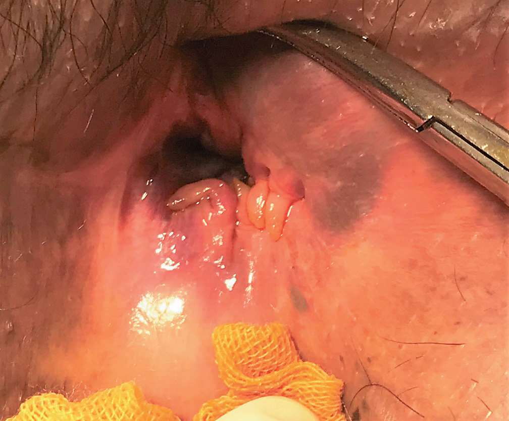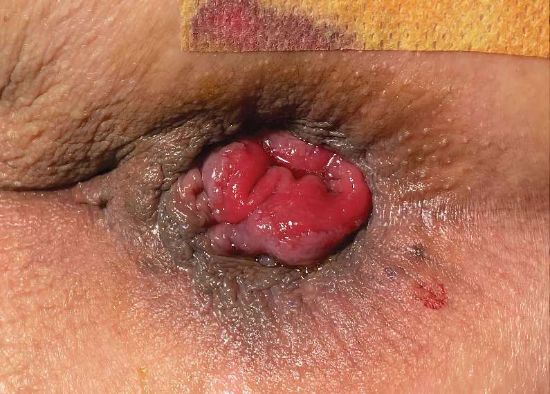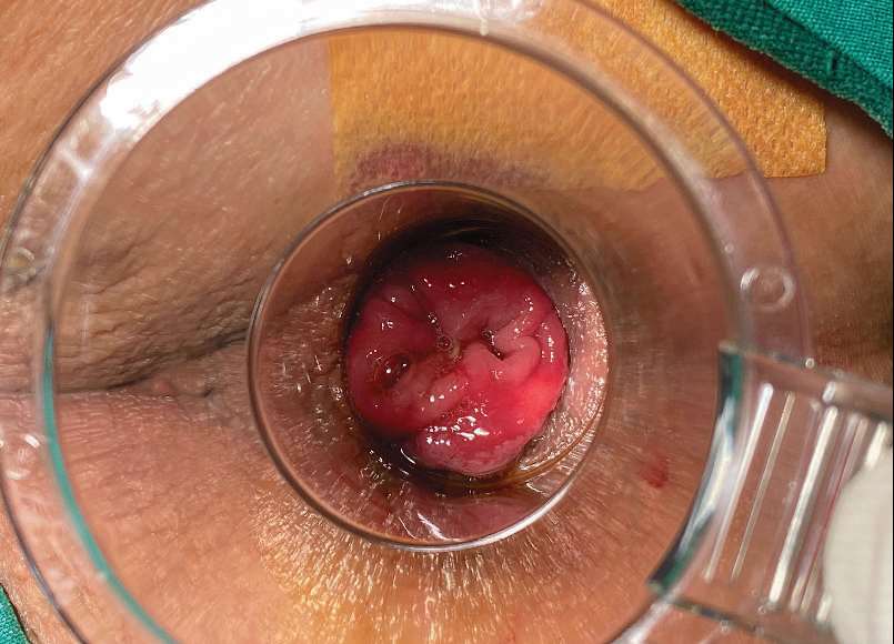 图 2—20 取出肛门镜后痔核黏膜一圈脱出肛外