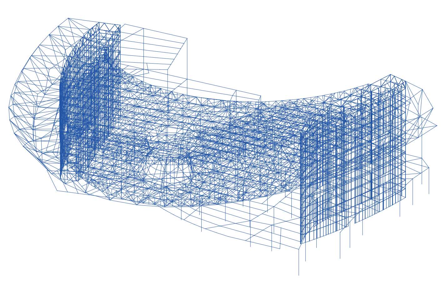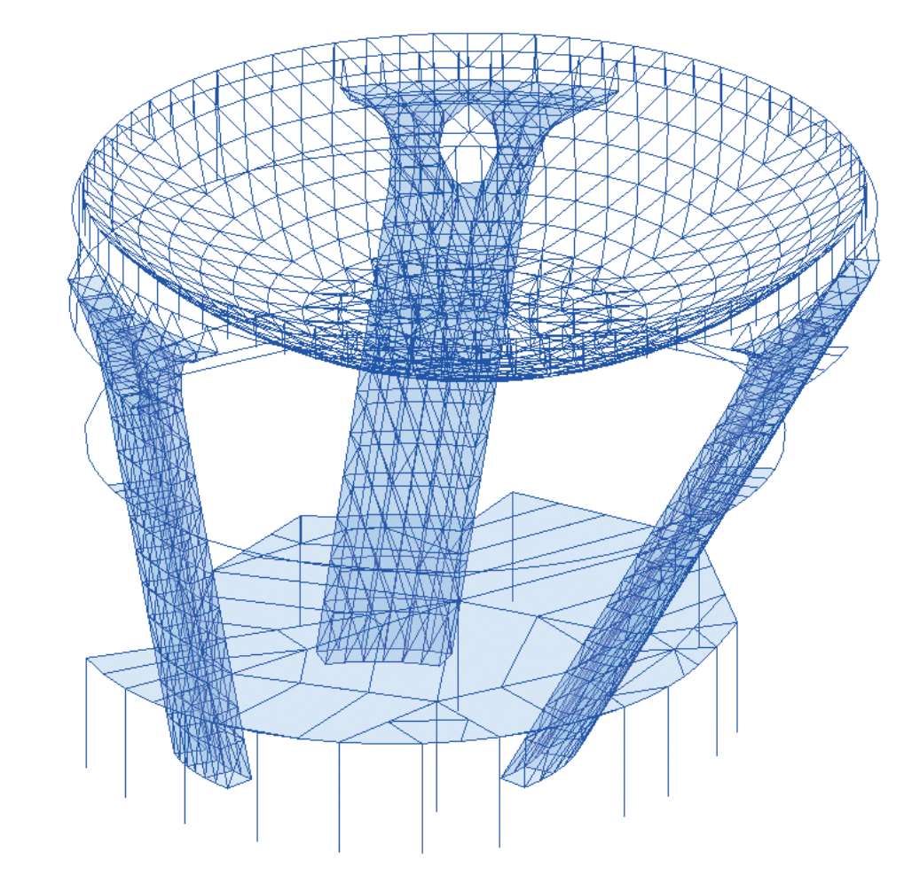 倒转穹顶区域独立模型选取时不考虑外围结构及中庭旋转步道对其的影响,中庭旋转步道单独建模计算,不考虑地下室顶板对其约束作用,计算简图如图 2-40和图 2-41 所示。