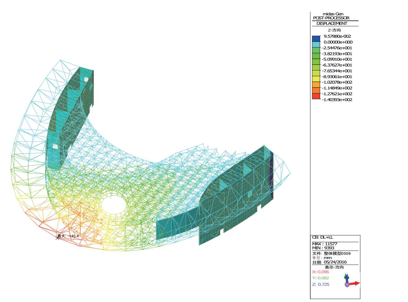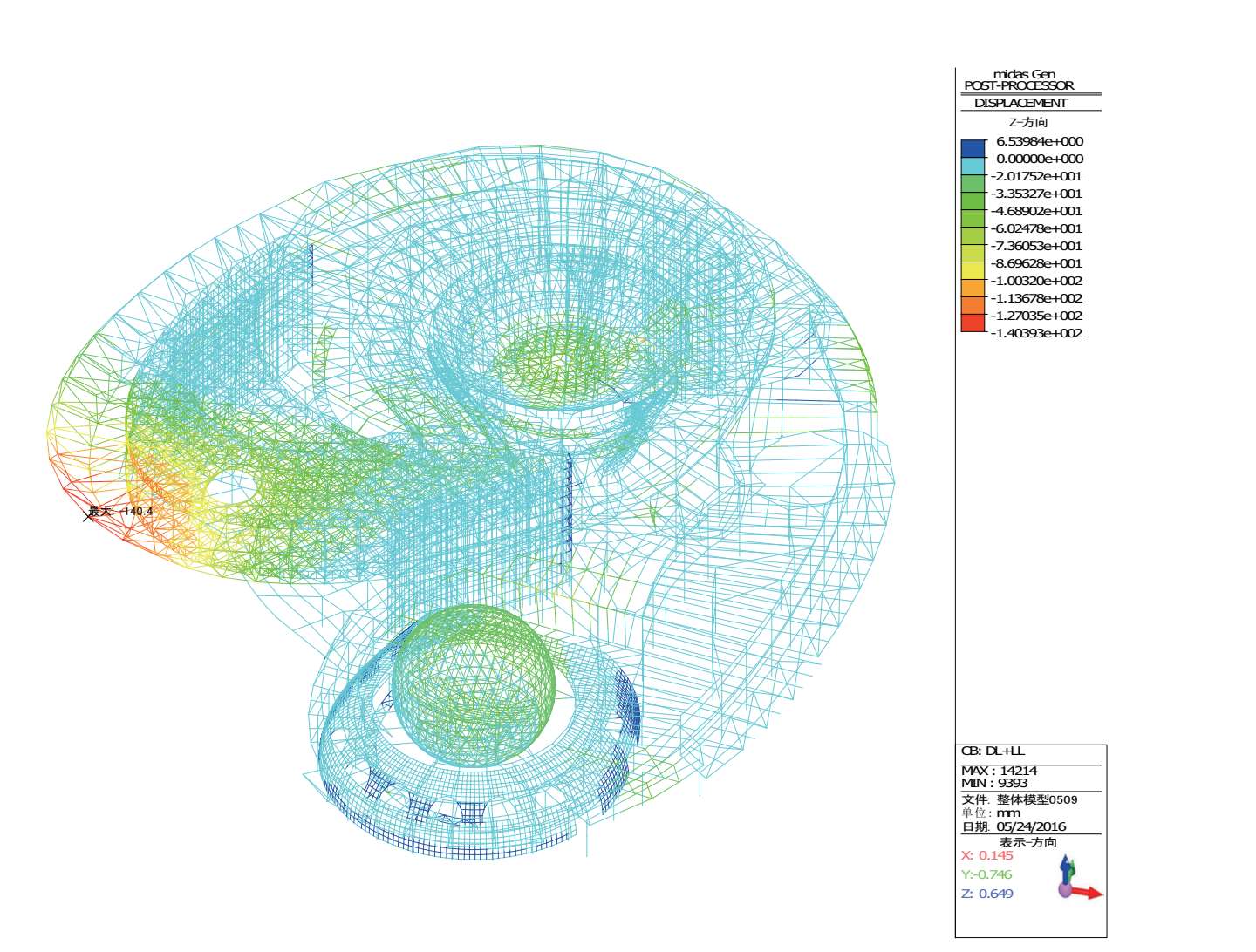 恒+活作用下整体结构的最大竖向位移为-140.4mm,位于大悬挑区域悬挑端部(图 2-27)。