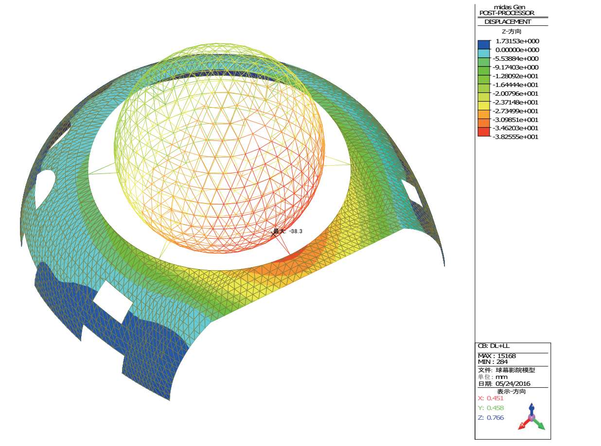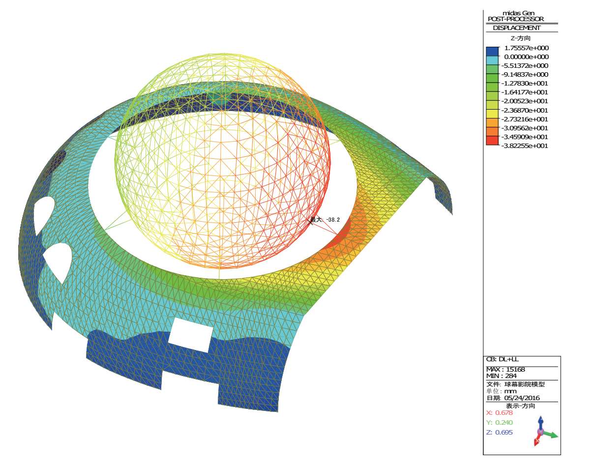 (2)铰接模型。恒+活作用下球幕影院结构的最大竖向位移为-38.2mm(图 2-50),与刚接模型相比没有什么变化。说明钢球体与混凝土壳体之间连接的刚性对球体的变形影响可以忽略。
