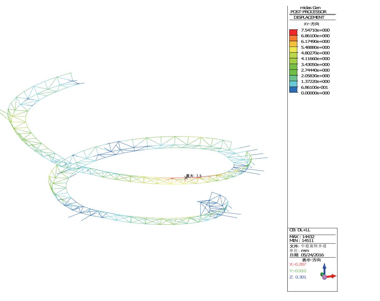 恒+活作用下倒转穹顶区域旋转步道的最大水平位移为 7.5mm(图 2-46)。