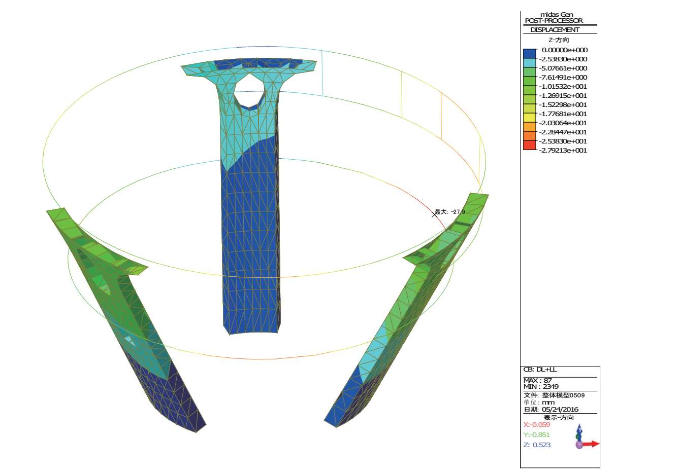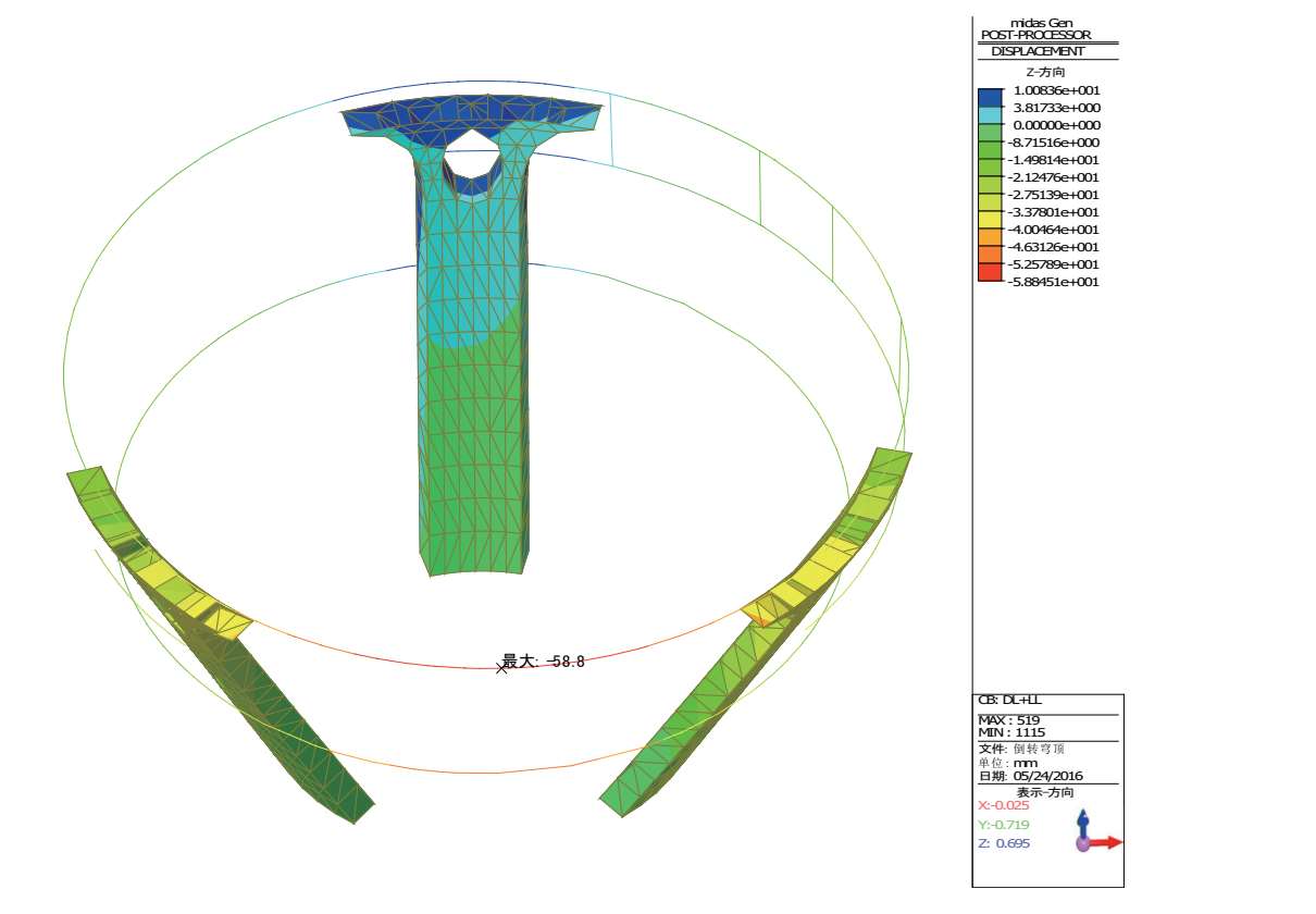 图 2-43 恒+活作用下倒转穹顶区域“三脚架”结构的竖向位移